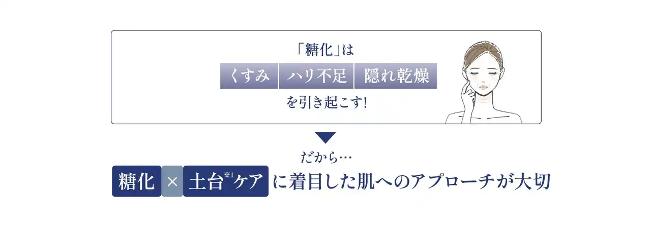 隠れ乾燥ケア成分。くすみ※3、ハリ不足、隠れ乾燥など見た目印象を左右する糖化に着目しています。 |