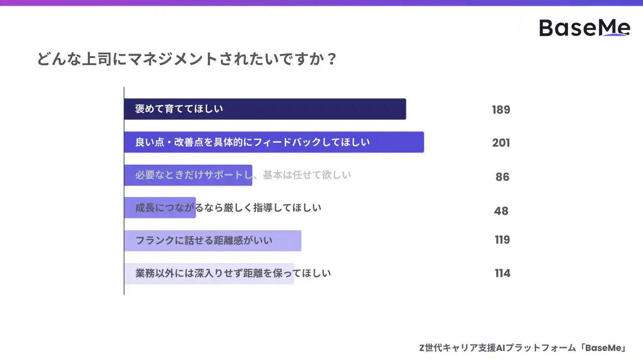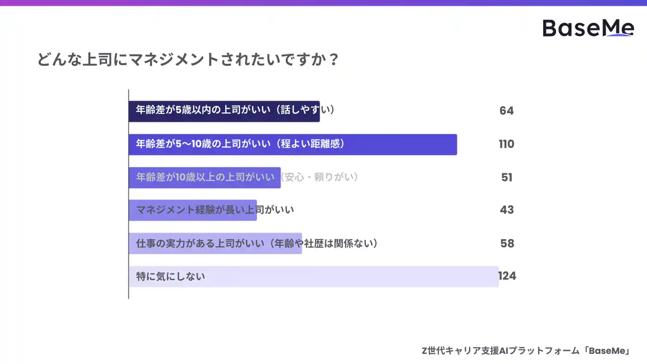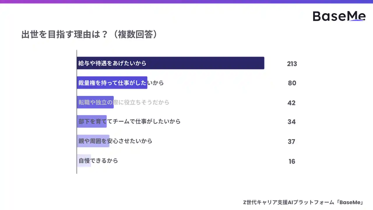 価値観軸で企業と出会えるZ世代キャリア支援AI「BaseMe(ベースミー)」を運営する株式会社ベースミー(本社:東京都渋谷区、代表取締役CEO:勝見 仁泰)は、24~27卒の新卒世代450名を対象に、「出世欲と理想のマネジメント」に関する調査を実施しました。 |