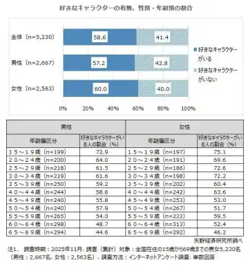 2025年11月に全国在住の15歳から69歳までの男女5,230名(男性:2,667名、女性:2,563名)に対し、好きなキャラクター(キャラクター単体)の有無について尋ねたところ(単数回答)、「好きなキャラクターがいる」と回答した割合は58.6%となった。