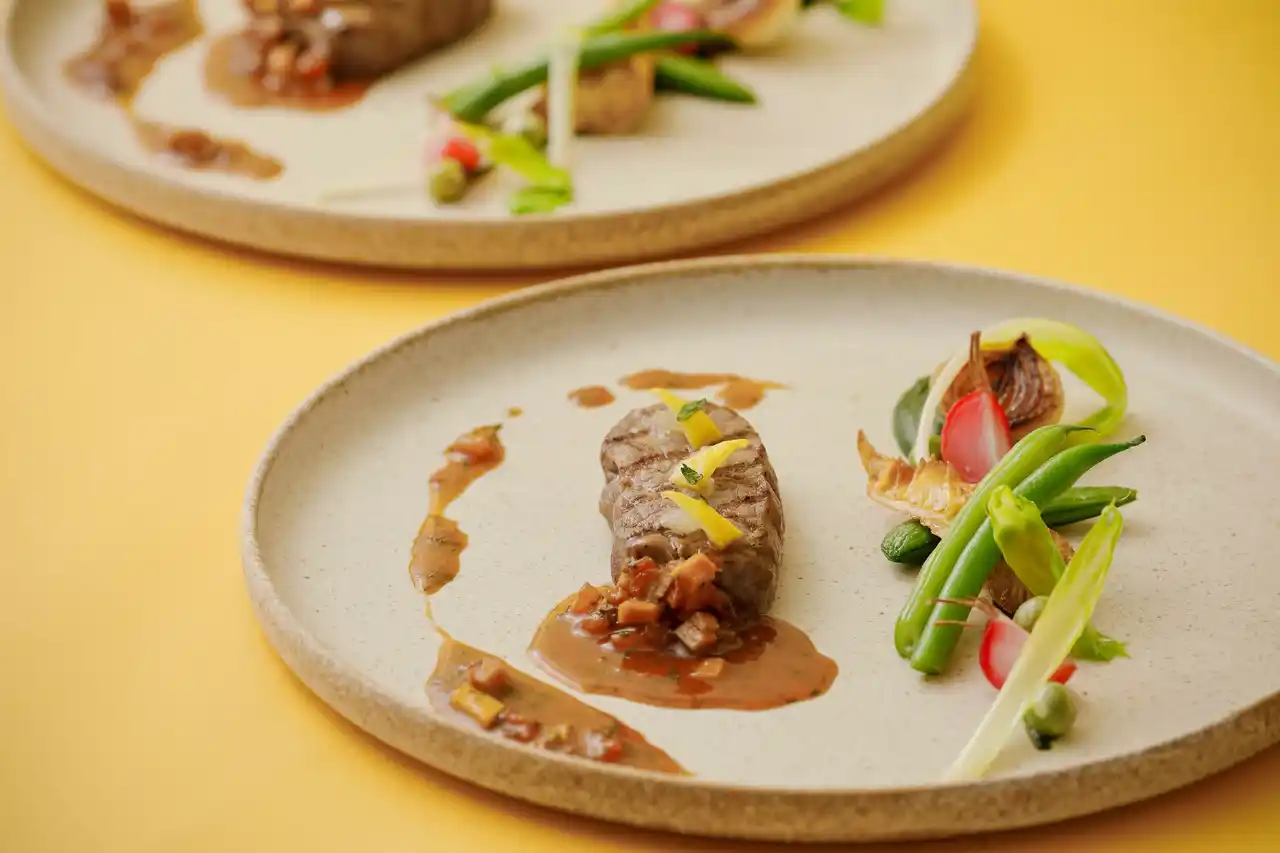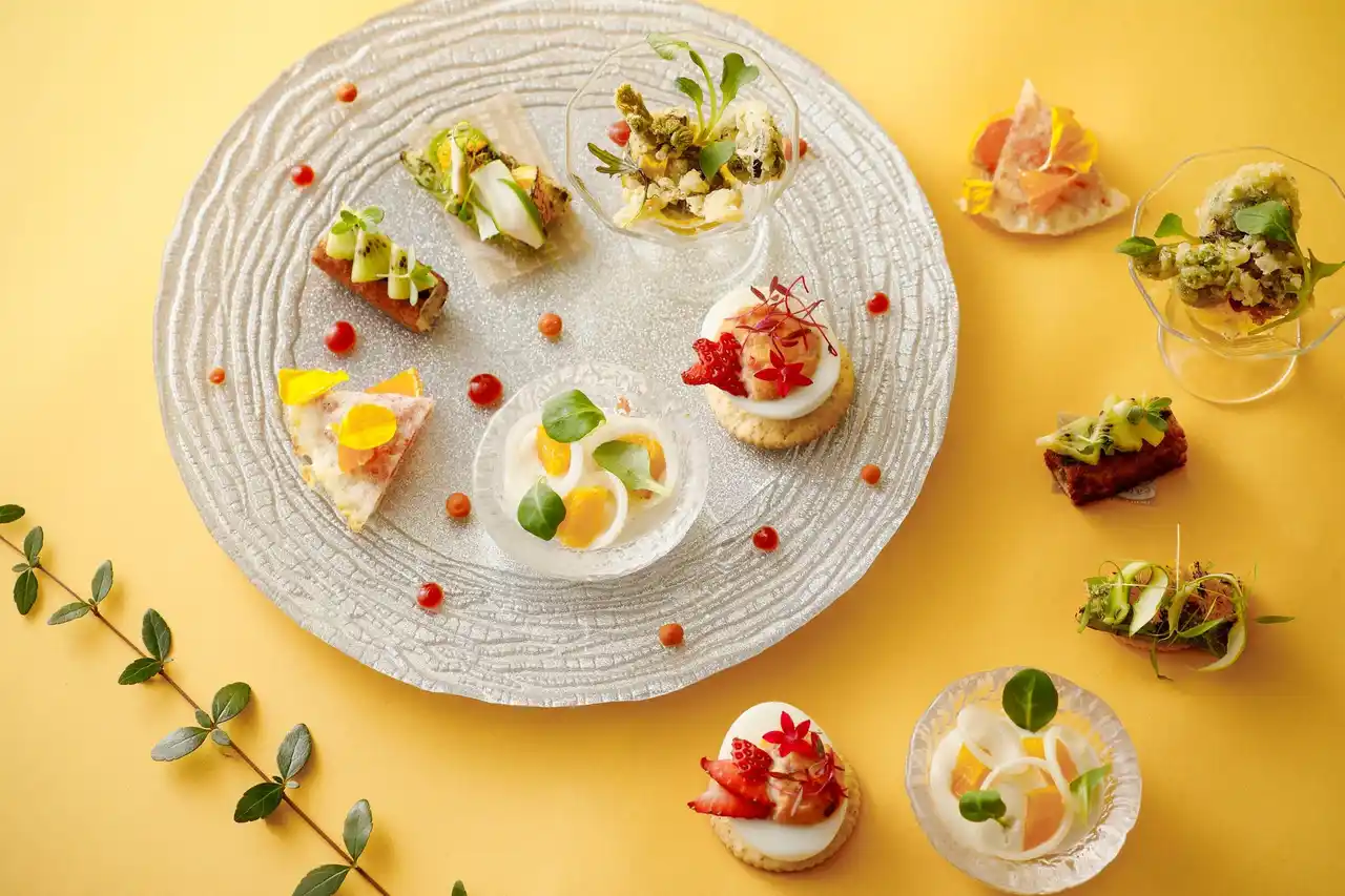 春の果実が咲き誇るような華やぎをテーマにしたハイティーは、和歌山県産のいちご「まりひめ」をはじめ、八朔や甘夏などの柑橘やキウイフルーツなど旬の恵みを贅沢に味わう特別なイブニングタイムをお届けします。南高梅の香りとまりひめの甘さを纏わせた平飼い卵のウフマヨネーズや、キウイフルーツをのせ香ばしく焼き上げたクエサンドなど、フルーツのほのかな酸味や甘味をアクセントにしたセイボリー6品をご用意。メインは上質な旨みをもつ仔牛のグリルを、木の芽の清々しい香りを利かせたシャスールソースでご堪能いただけます。