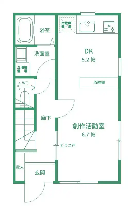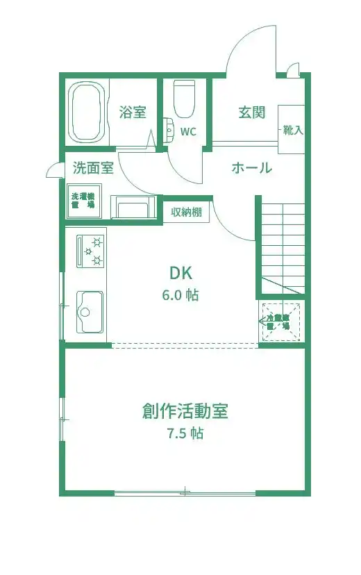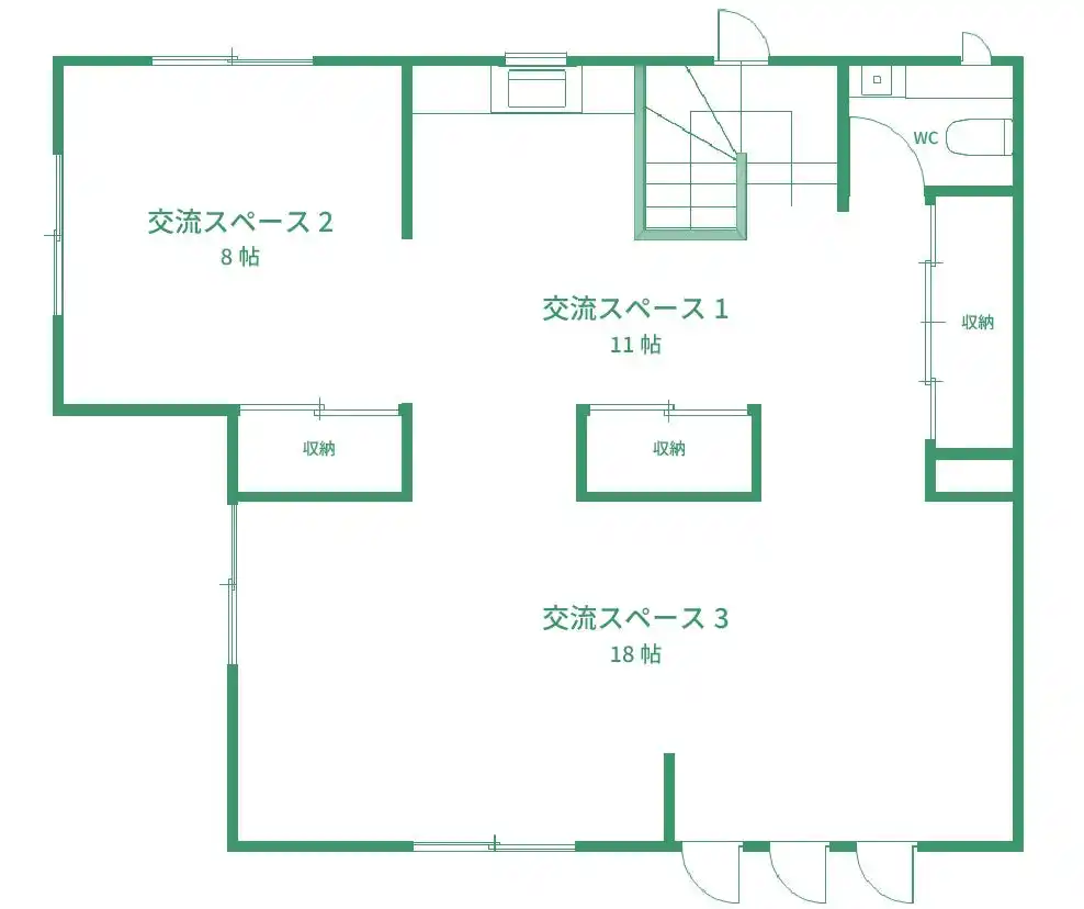 各シェアハウス棟に、創作活動で汚しても良い共用の創作活動室を用意するとともに、一定の条件下で併設の地域交流施設を創作活動や作品発表等に利用可能