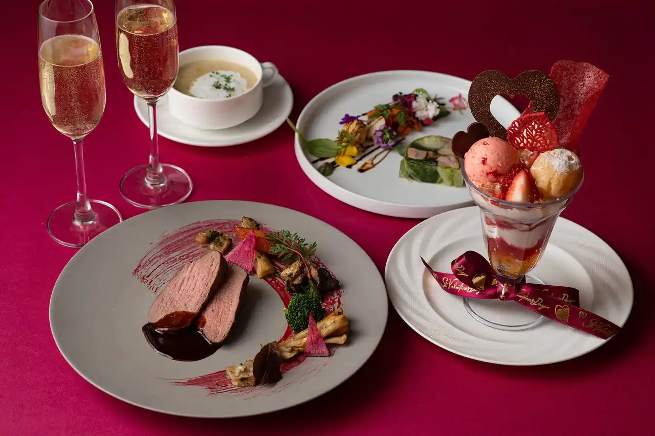 | いずれのコースも、季節の食材を丁寧に仕立てた料理の締めくくりに、バレンタイン限定「苺のパフェ」をお楽しみいただけます。甘酸っぱい苺と濃厚なクリームが織りなす、洗練された味わいと美しいビジュアルが、ふたりの時間に華やぎを添えます。 | ||||||||||