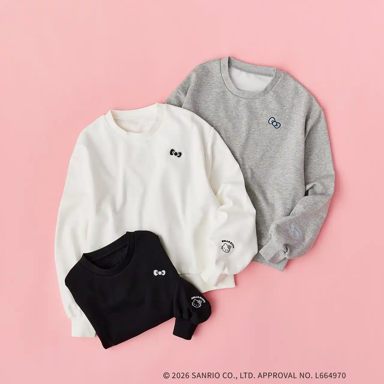 ハローキティのアイコンでもあるリボンモチーフを胸元に刺繍した裏毛プルオーバー。 |