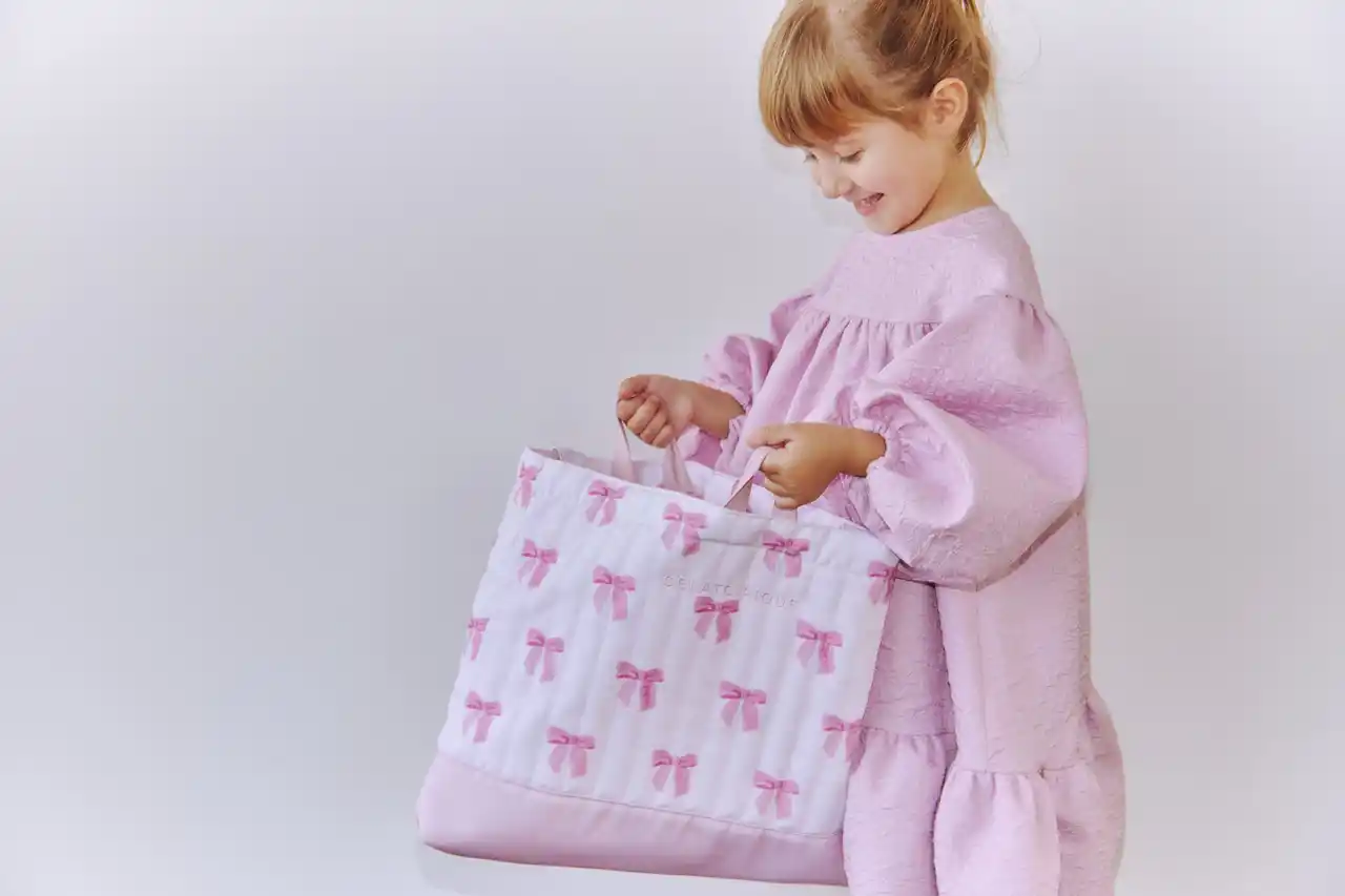 キルト生地のやわらかな質感と、思わず目を引く可愛らしいデザインが魅力のレッスンバッグ。 |