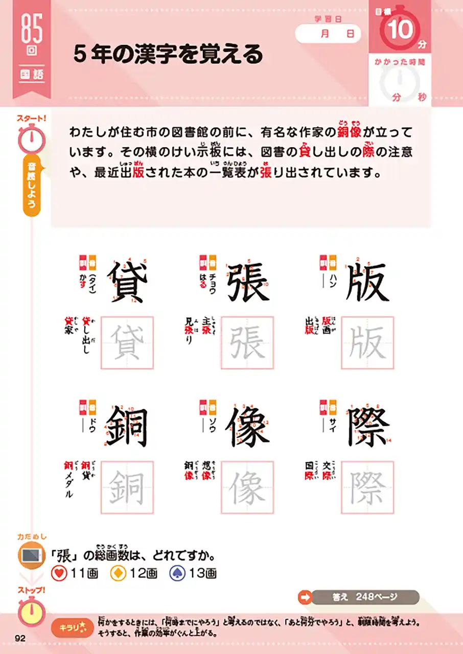 本(問題集)には、5教科で合計216回分を収録。スモールステップに構成されているので、学校の進度に合わせた学習も、自分のペースで取り組む学習も、どちらも無理なく進めやすくなっています。 |
