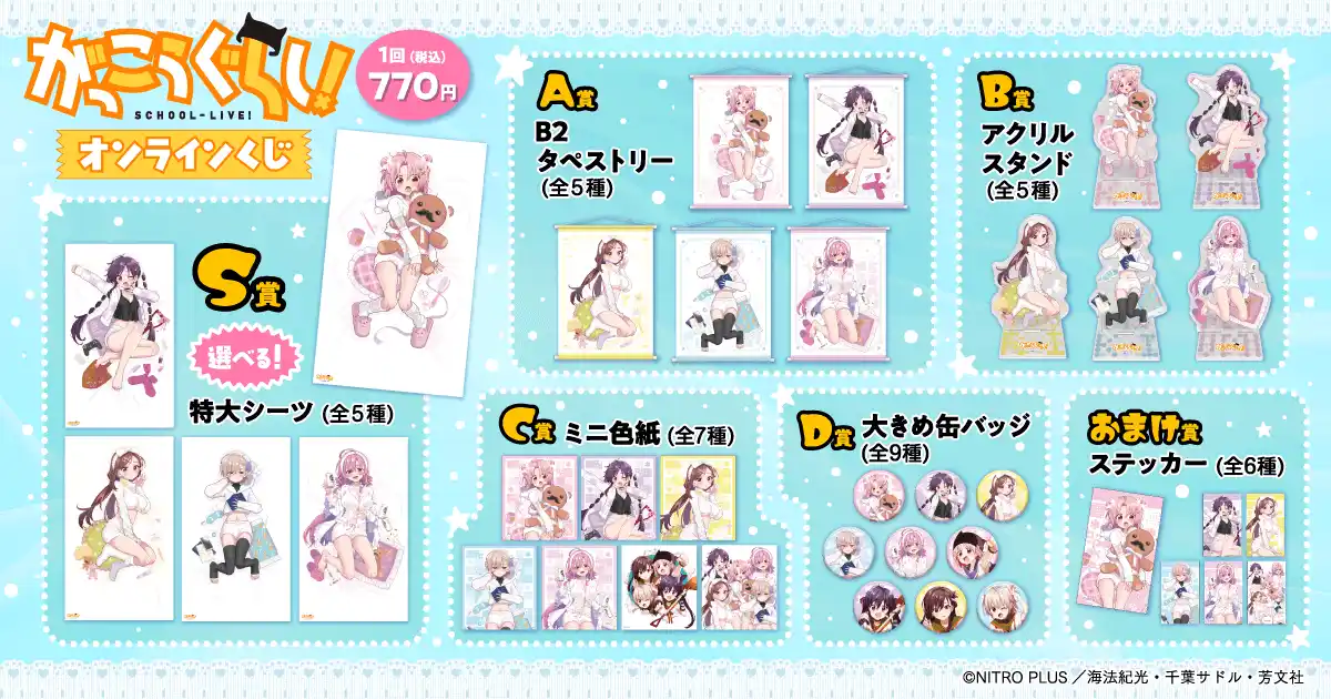 株式会社KADOKAWA(本社:東京都千代田区、取締役 代表執行役社長 CEO:夏野 剛、以下 KADOKAWA)は、運営するオンラインくじサービス「くじ引き堂」において、「がっこうぐらし! 」の豪華賞品が手に入る<がっこうぐらし! オンラインくじ>を、2026年1月29日(木)12時より販売します。 |