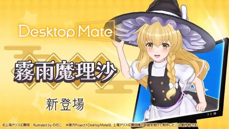 株式会社インフィニットループ(本社:北海道札幌市、代表取締役社長:小野真弘)は、デスクトップマスコットプラットフォーム「Desktop Mate」において、東方Projectの人気キャラクター「霧雨魔理沙」と「ゆっくり魔理沙」を2026年1月22日(木)12時より配信開始いたしました。さらに、両DLCをセットで購入できるお得なバンドル「霧雨魔理沙&ゆっくり魔理沙」も同時発売いたします。 |