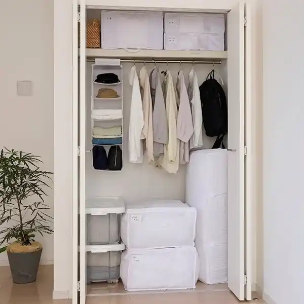 外側がポリエステル生地で汚れをさっと拭けるお手入れ簡単な布製収納です。クローゼット内のデッドスペースを有効活用できます。 |