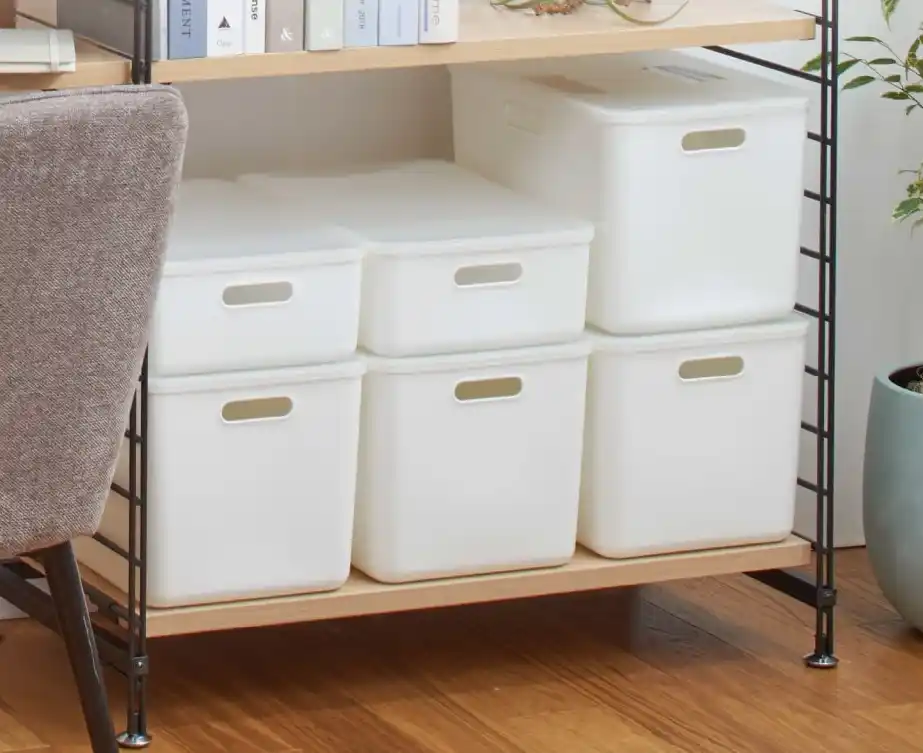 外側がポリエステル生地で汚れをさっと拭けるお手入れ簡単な布製収納です。軽いので上段にもしまいやすく、使わないときでもコンパクトに畳めるスペパ抜群の収納です。 |