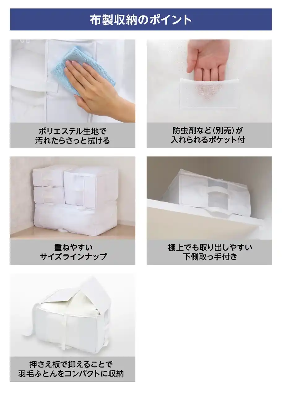 外側がポリエステル生地で汚れをさっと拭けるお手入れ簡単な布製収納です。押さえ板で抑えることで羽毛ふとんをコンパクトに収納できます。Lサイズは立てて収納可能です。 |