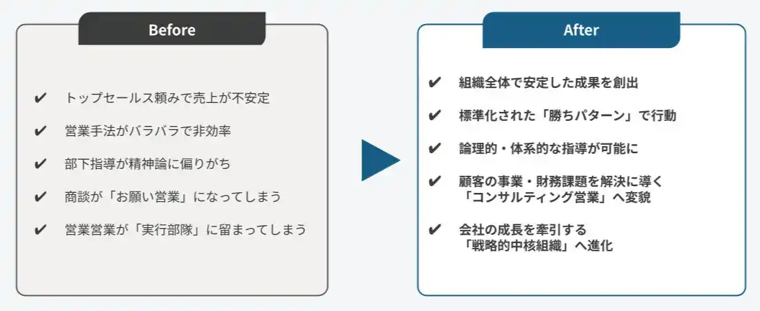 しかし、お客様との対話の中で、ツール以前の根本的な課題が浮き彫りになりました。営業の属人化は、ツールの問題ではなく、「体系的かつ実践可能なノウハウの不在」と「科学的なマネジメントの仕組み」の問題だということを。 |