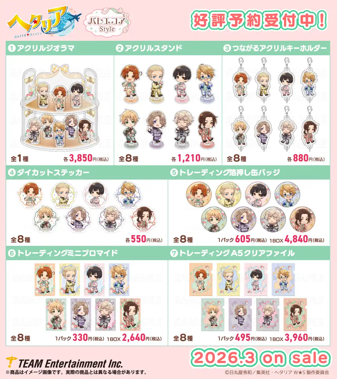 | 株式会社エディア(本社:東京都千代田区、代表取締役社長:賀島 義成)の子会社、株式会社ティームエンタテインメント(本社 :東京都千代田区、代表取締役社長 :賀島 義成 以下 :ティームエンタテインメント)は、2026年3月に、アニメ「ヘタリア World★Stars」のオリジナルグッズの発売を決定したことを、お知らせいたします。 | |||
