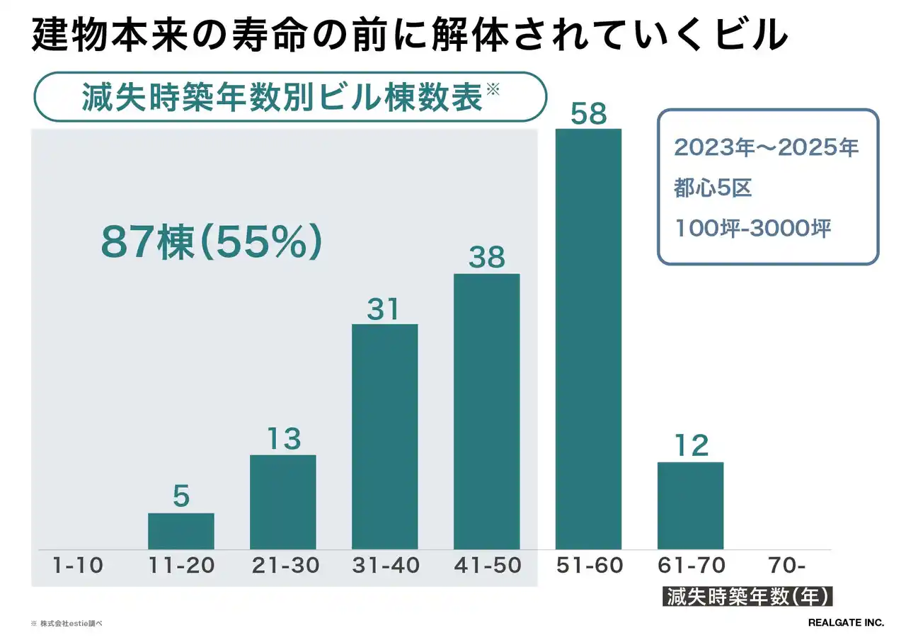 2.建物の短寿命化による環境負荷増大への対応:建物の骨組みであるコンクリートは本来100年程度の寿命があると言われていますが、当社の調査では、東京都心部の商業ビルのうち、実に55%が法定耐用年数(50年)を満たさずに解体されているという深刻な実態が明らかになりました。 |