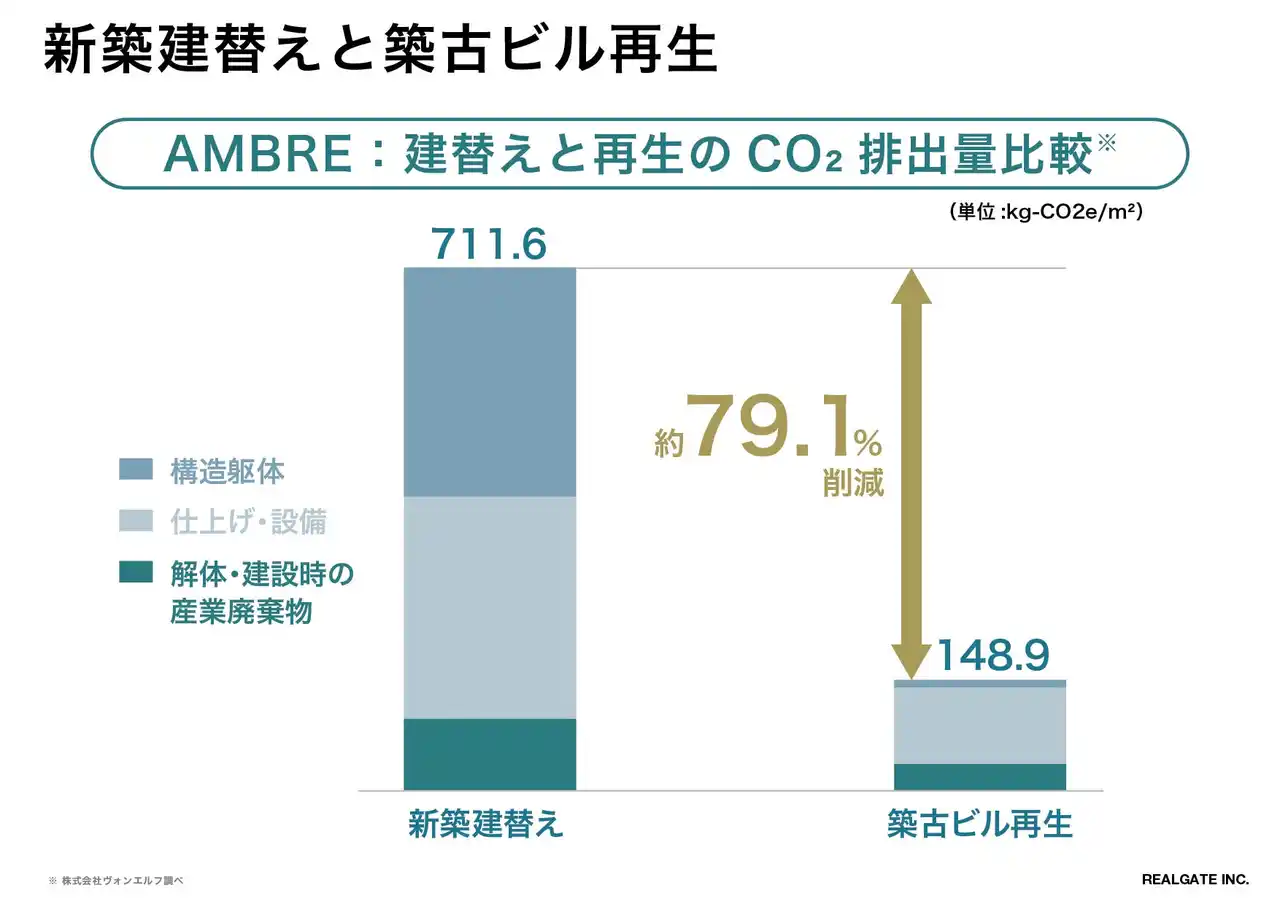 本来であればあと数十年は現役でいられるはずの良質なビルが寿命の半分で解体され、また新たなビルに建て替わる現状は、建設時に多くの資源とエネルギーを消費するため、地球温暖化問題の観点からも大きな課題となっています。建物をゼロから建てる新築開発と比較して、既存ビルの構造体を維持したまま再生する手法は、建設段階における二酸化炭素(CO2)排出量を削減することが可能です。当社物件を基にした試算によれば同規模・同用途の新築開発と比較して、約79%の削減が可能であるとの結論を得ました。 |