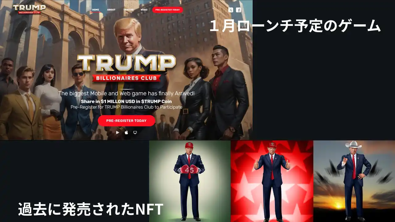 $TRUMPを発行する以前にも何度かNFTの販売が行われましたが、1月からは初のWeb3ゲーム「Trump Billionaires Club」のローンチが予定されています。事前登録者へはポイント数に応じてゲーム用のNFTが配布されており、アイテムの課金などにTRUMPが使用できると公式サイトには記載が行われています。 |