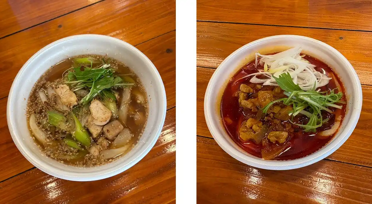 2024年12月の第5回埼玉うどんフェアに登場したうどんの名店が再び戸田ボートに降臨。延喜さんといえば、前回にも出品された『特製かれぇうどん』があまりにも有名だが、今回は『鶏肉とネギの胡麻かけうどん』と『大久保レッド』の2種類のうどんが登場。前者は鶏肉とネギを油で炒め、すりごまをたっぷりかけた逸品。かたや後者は千葉県のご当地ラーメンをイメージ。豚肉とひき肉と玉ねぎをラー油で揚げ煮した具材が乗った贅沢なうどんだ。 |