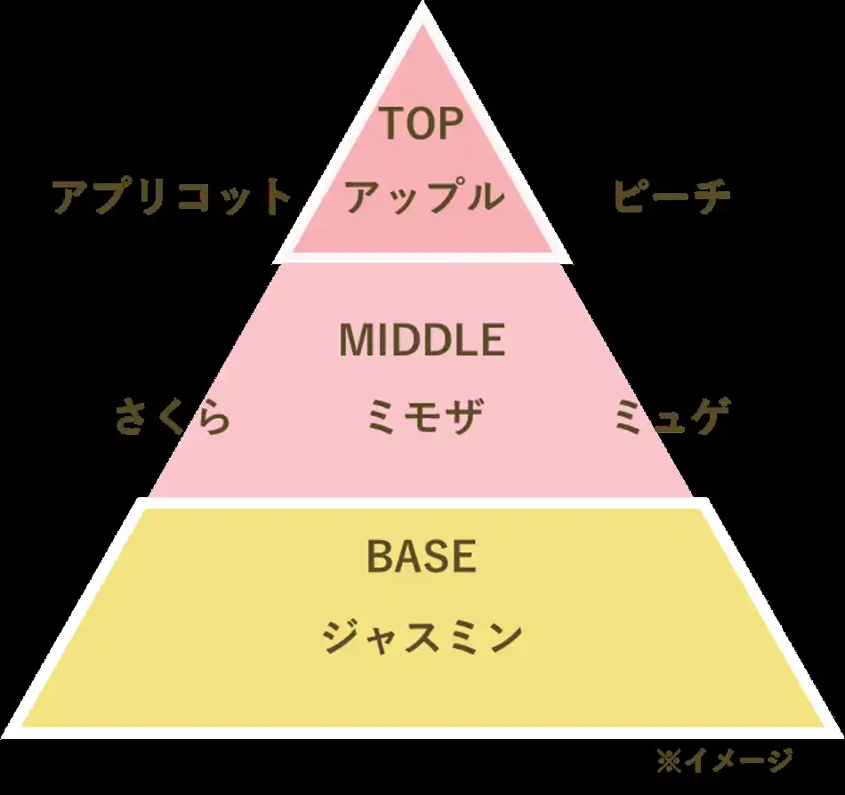 さくらやミモザなど春を連想させる香りを贅沢に使用し、アプリコットやピーチでアクセントをつけた明るく華やかなフルーティフローラル調の香りです。 |
