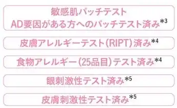 | *3 すべての方の肌に合うというわけではありません。 *4 すべての方にアレルギーが起こらないというわけではありません。 *5 すべての方に刺激が起こらないというわけではありません。 | |||||||||||||