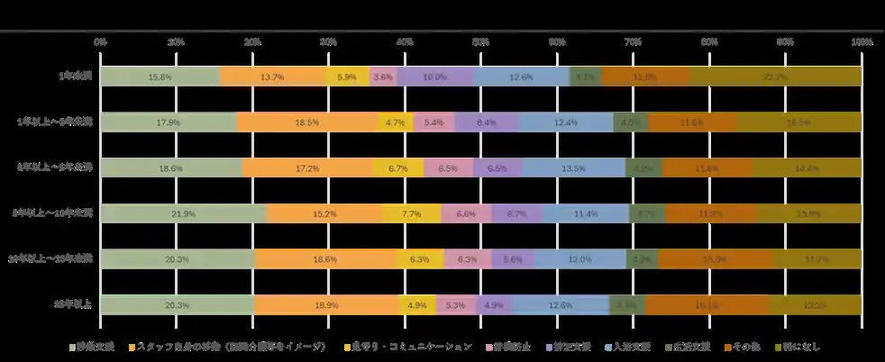 ほぼ全ての経験年数で1位「移乗支援」、2位「スタッフ自身の移動」、3位「入浴支援」となりました。1年以上3年未満のみ、「スタッフ自身の移動」が「移乗支援」を上回っていますが、その差はわずか0.6ポイントです。 |
