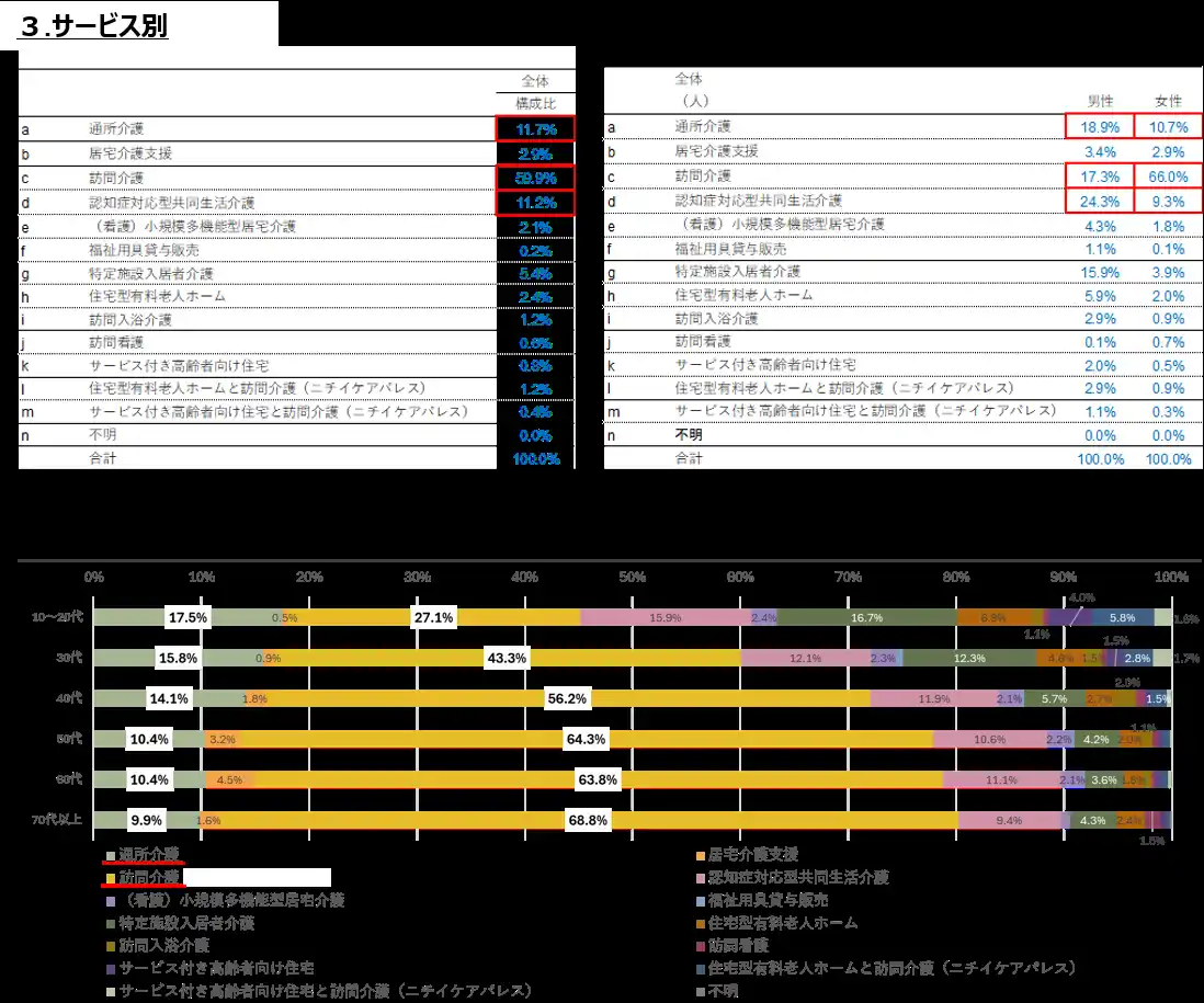 以下に、ニチイグループ内で従事する職員が多い通所介護、訪問介護、認知症対応型共同生活介護の3つのサービスの結果について記載します。 |