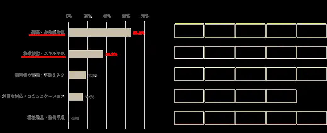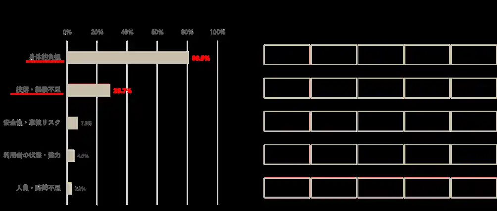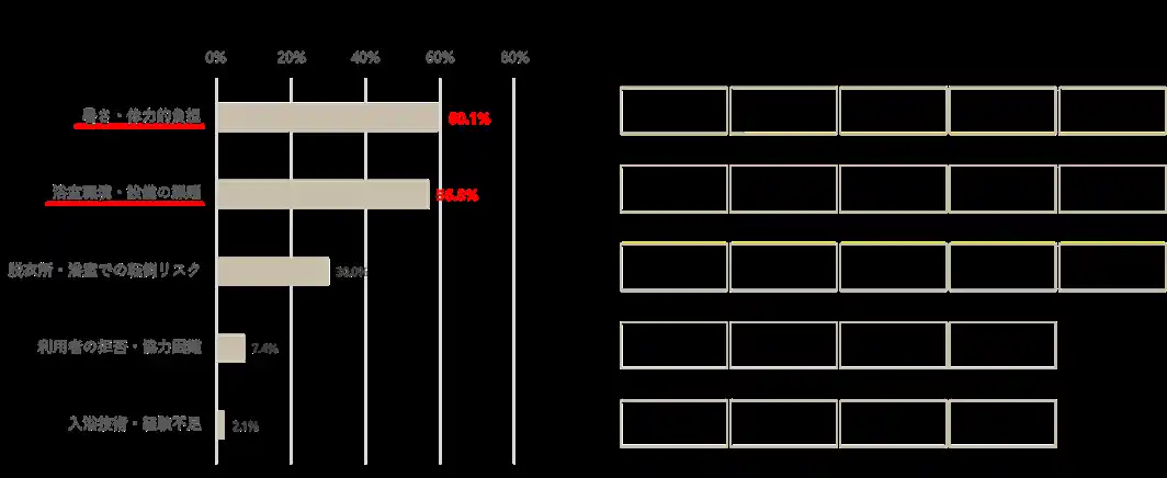 一方、通所介護における課題では、「入浴支援」が「移乗支援」に次ぎ2位となりました。こちらも深掘りした結果、利用者様の移乗などの身体的負担に加え、高温多湿といった作業環境そのものが、大きな負担となっている実情が明らかになりました。 |