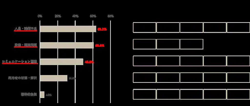 その結果、「見守り・コミュニケーション」という業務を通して感じる負担の中で多かったのは「人員・時間不足」(63.3%)と「設備・環境問題」(60.6%)となりました。また、「コミュニケーション困難」によるものとする回答も約5割(48.8%)となりました。 |