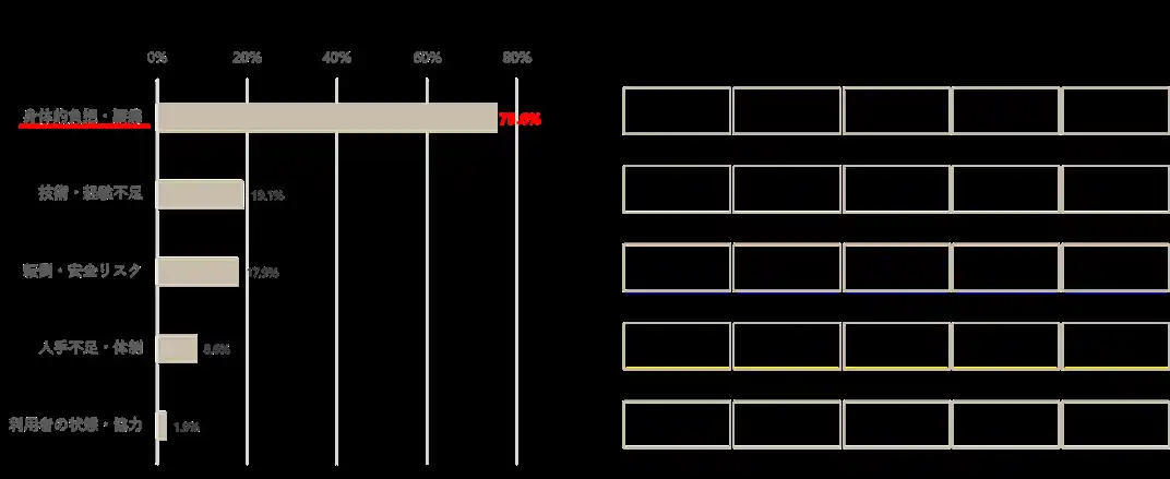 その結果、「移乗支援」という業務を通して感じる負担の中で最も多かったのは「身体的負担・腰痛」で75.6%に達しました。通所介護では「移乗技術・スキル不足」によるとする回答も約4割ありましたが、訪問介護では「技術・経験不足」は2割弱(19.1%)にとどまりました。 |