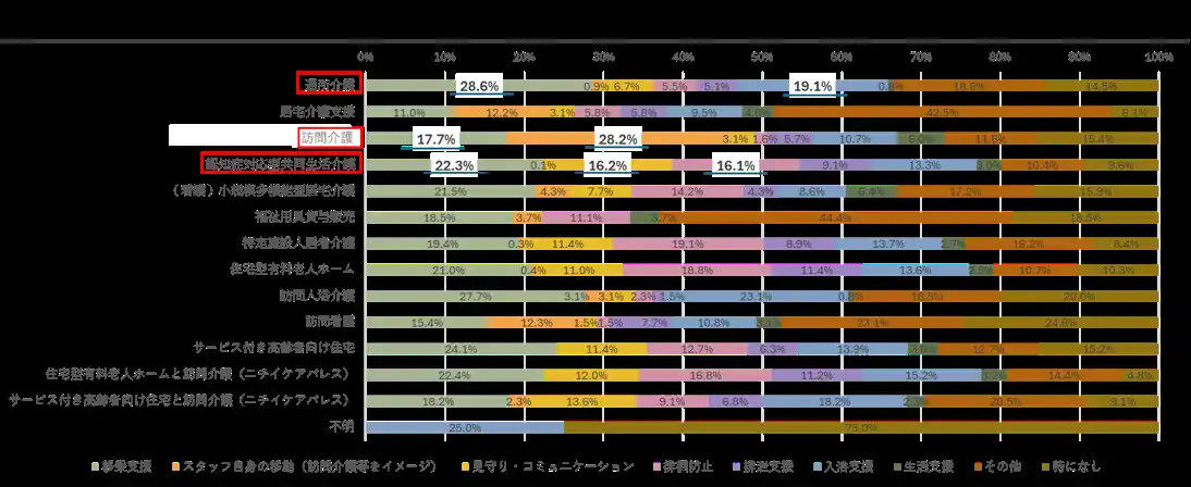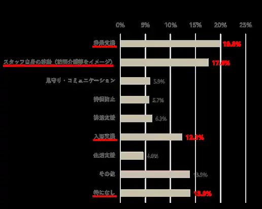 次いで、利用者様の居宅を訪ねてサービスを行う訪問介護の「スタッフ自身の移動」が約18%、入浴の介助を行う「入浴支援」が約12%となりました。 |