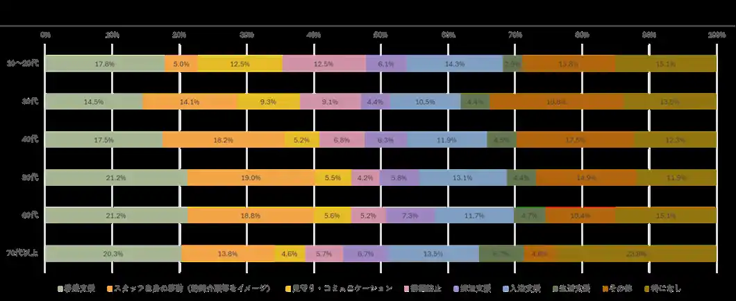 ほぼ全ての年代で、「移乗支援」が最も高い比率となっています。40代のみ「スタッフ自身の移動」が上回っていますが、その差はわずか0.7ポイントです。 |