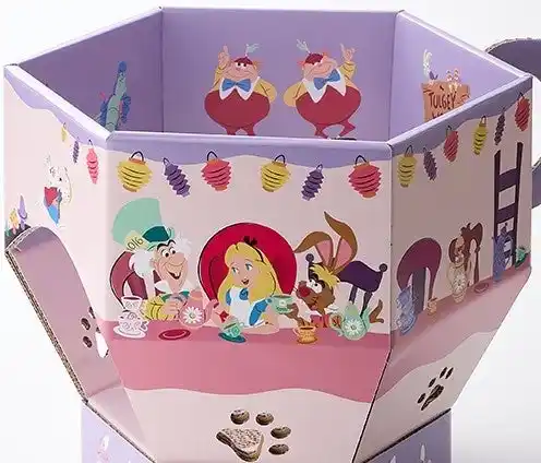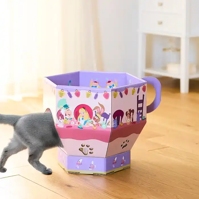 『ふしぎの国のアリス』に登場するティーパーティーのシーンをデザインした、段ボール製のティーカップ型爪とぎです。商品の外側だけでなく内側にも映画の主人公・アリスやマッドハッター、三月うさぎ、チェシャ猫などの多くの人気キャラクターが描かれています。 |