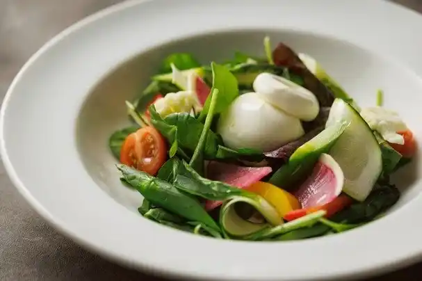 ブラッティーナチーズとは、小さなモッツアレラチーズの袋に細かいモッツアレラとクリームを閉じ込めた可愛らしい見た目のチーズ。エンダイブ、ベビーリーフなどの葉物野菜とバルサミコ、白ワインビネガーにレモンのドレッシング、仕上げにはハーブオイルを。 |