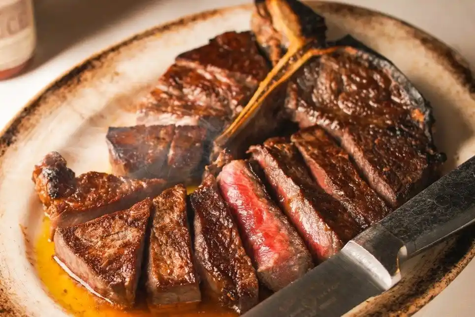 アメリカから輸入したUSDA(アメリカ合衆国農務省)認定 プライムビーフを店内の専用熟成庫で管理。最低4週間しっかりと熟成。お肉の旨味を最大限まで高め、仕上げには専用のブロイラーでお皿ごと高温にて調理。熱々のままテーブルへお届け。ご家庭では味わえない一皿を心ゆくまでお楽しみいただけます。(写真はTボーンステーキ) |