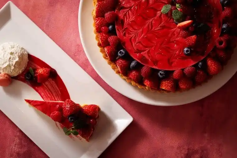 完熟した苺とラズベリーを惜しみなく敷き詰めたベリータルト。果実のフレッシュな酸味・芳醇な甘みがバターの香るタルト生地と調和。口いっぱいに春らしい彩りが広がる。 |