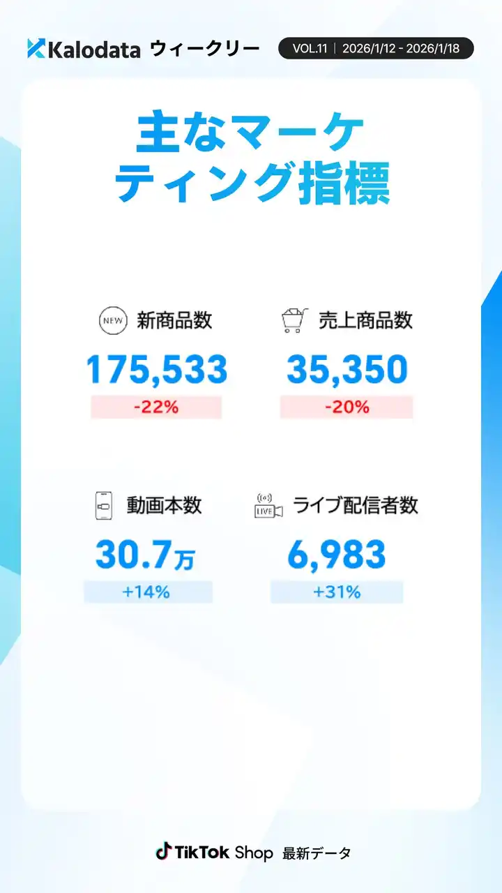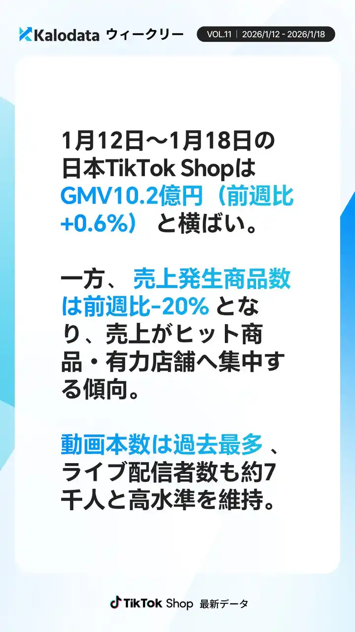 Kalodata Japan(運営:株式会社Kalowave Japan)の最新データ分析によると、2026年1月12日~1月18日のTikTok Shop日本市場では、GMVは10.2億円(前週比+0.6%)と横ばい推移となりました。一方で、売上が発生した商品数は前週比-20%と大きく減少しており、売上が一部のヒット商品・強い店舗に集中する構造が鮮明です。 投稿活動は活発で、動画本数は過去最多の約30.7万本、ライブ配信者数も約7,000人と、12月末の大型セール期に次ぐ高水準を記録しました。 |
