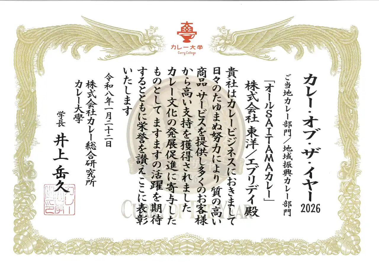| 「笑顔創造」を企業理念とする株式会社東洋(本社:埼玉県桶川市、代表取締役:中村秀夫、以下「当社」)が展開するクレーンゲーム専門店「エブリデイ」にてクレーンゲームにて企画から参画し独占取り扱いをしている、「オールSAITAMAカレー」が1月22日『カレーの日』に、「カレー・オブ・ザ・イヤー2026」ご当地カレー部門/地域振興カレー部門を受賞いたしました。 | ||||||||||||||
