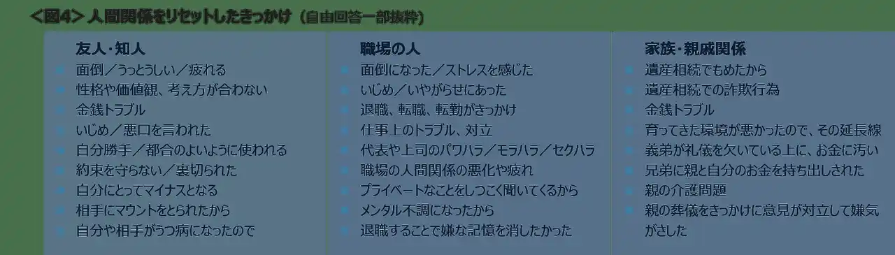 リセットしたきっかけは、友人・知人は「面倒/うっとうしい/疲れる」「性格や価値観、考え方が合わない」、職場は「面倒になった/ストレスを感じた」「いじめ/いやがらせにあった」、家族・親戚関係では「遺産相続」「金銭トラブル」という声が聞かれた。<図4> |