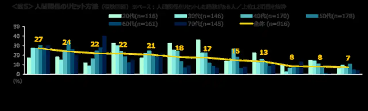 どのようにリセットしたかについては、「電話帳の連絡先を消す」「一時的に音信不通になる」がTOP2。特に20代は、LINEを含むSNSでのリセットが極めて高い。70代は「はがきでの連絡をやめる」が多かった。<図5> |