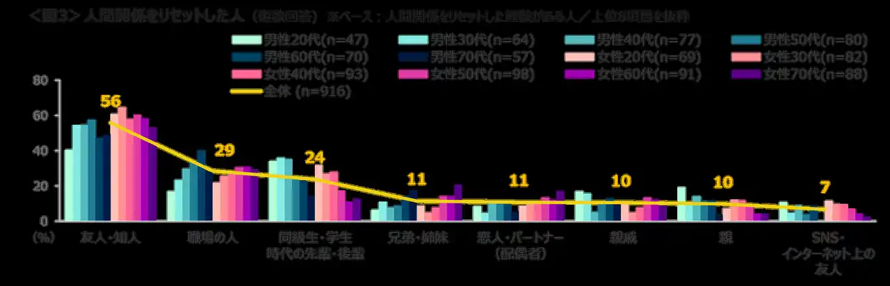 実際に人間関係をリセットした間柄では「友人・知人」が最多の56%、次いで「職場の人」「同級生・学生時代の先輩・後輩」が2割台。「友人・知人」はいずれの年代も女性、「職場の人」は男性60代、「同級生・学生時代の先輩・後輩」は男性20~40代でのリセットが多い。<図3> |