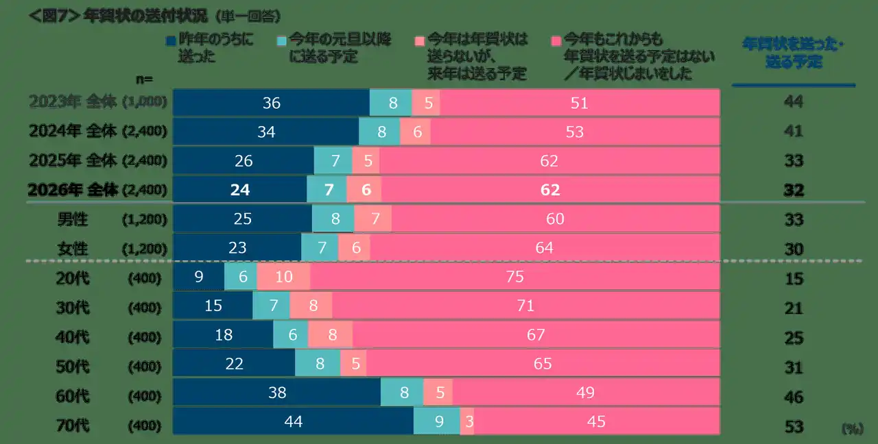 「年賀状を送った・送る予定」の人は32%、年代が上がるほど「送った・送る予定」の人は多い。過去も含め「年賀状じまいをした」人は62%と、はがきの値上げが響いた2025年結果と大きな変わりはなかった。<図7> |