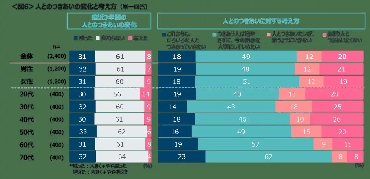直近3年間の人とのつきあいは「変わらない」が61%、「減った」31%、「増えた」8%。減った割合は年代による差はないが、増えた割合が最も多かったのは20代の14%であった。人とのつきあい方に対する考えは、「つきあう人は増やさずに、今の相手を大切にしていきたい」49%、「あまり人とつきあいたくない」20%、「これからも、いろいろな人とつきあっていきたい」18%。「あまり人とつきあいたくない」は、年代が若いほど増加傾向にあり、20代は28%を占める。<図6> |