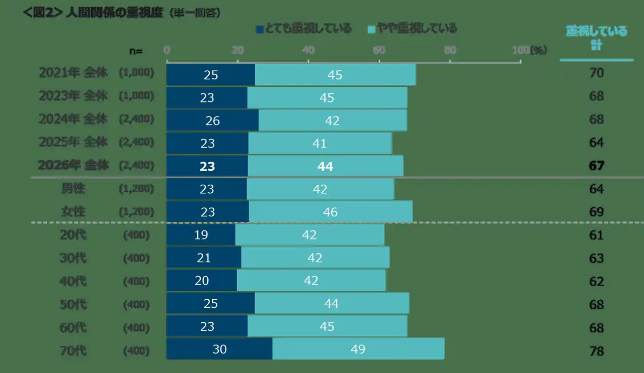 人間関係を「とても重視している」は23%、「やや重視している」は44%、合わせて67%は人間関係を重視している。 70代の重視度は78%と最も高く、低いのは20~40代であった。<図2> |
