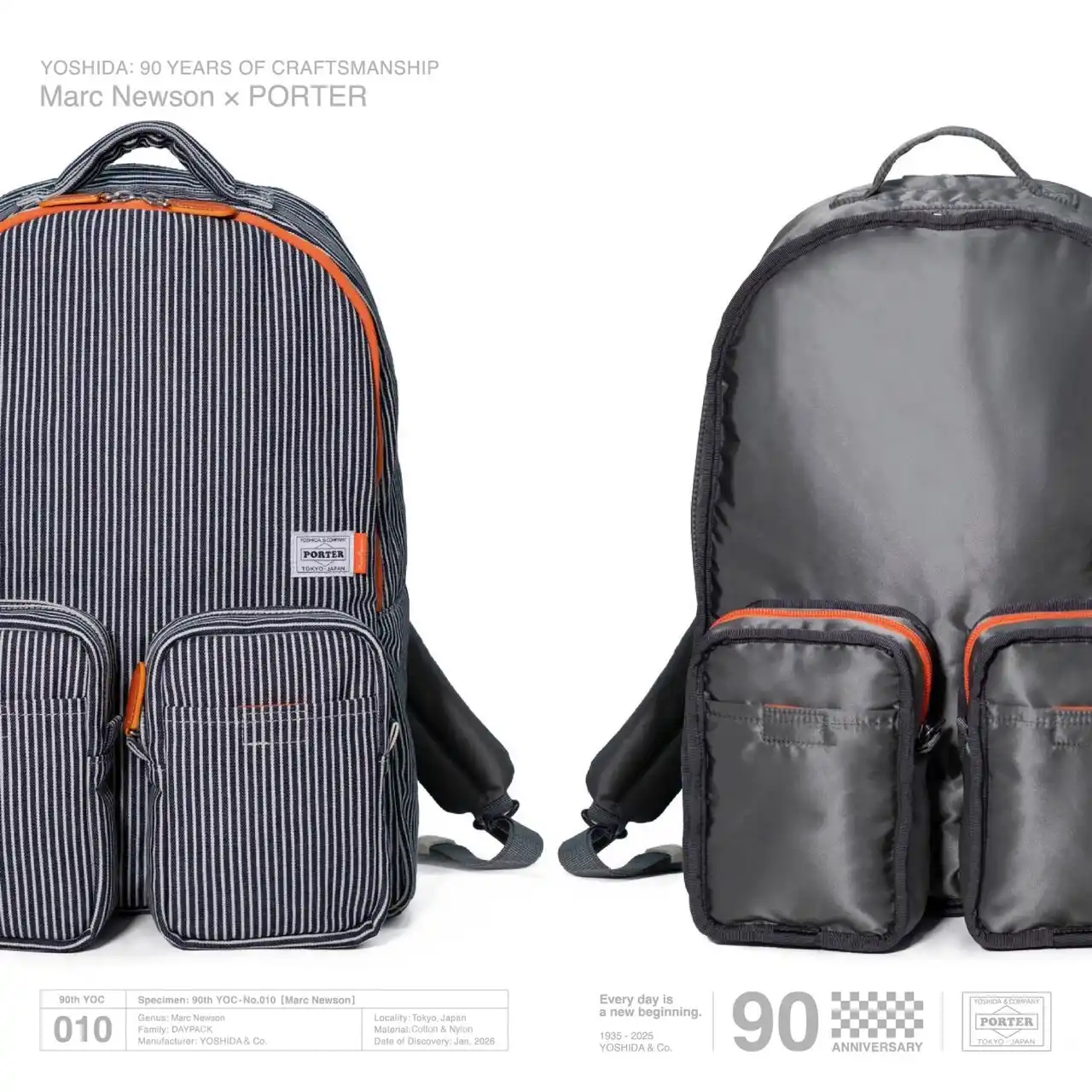 今回のコラボレーションは、2つの象徴的な素材によるフルリバーシブル仕様を採用しました。片面にはMarc Newson氏と深い関わりを持つヒッコリー、もう一方の面にはPORTERを象徴するナイロンツイルを使用し、シチュエーションや気分に合わせて表情を変えることができます。 |