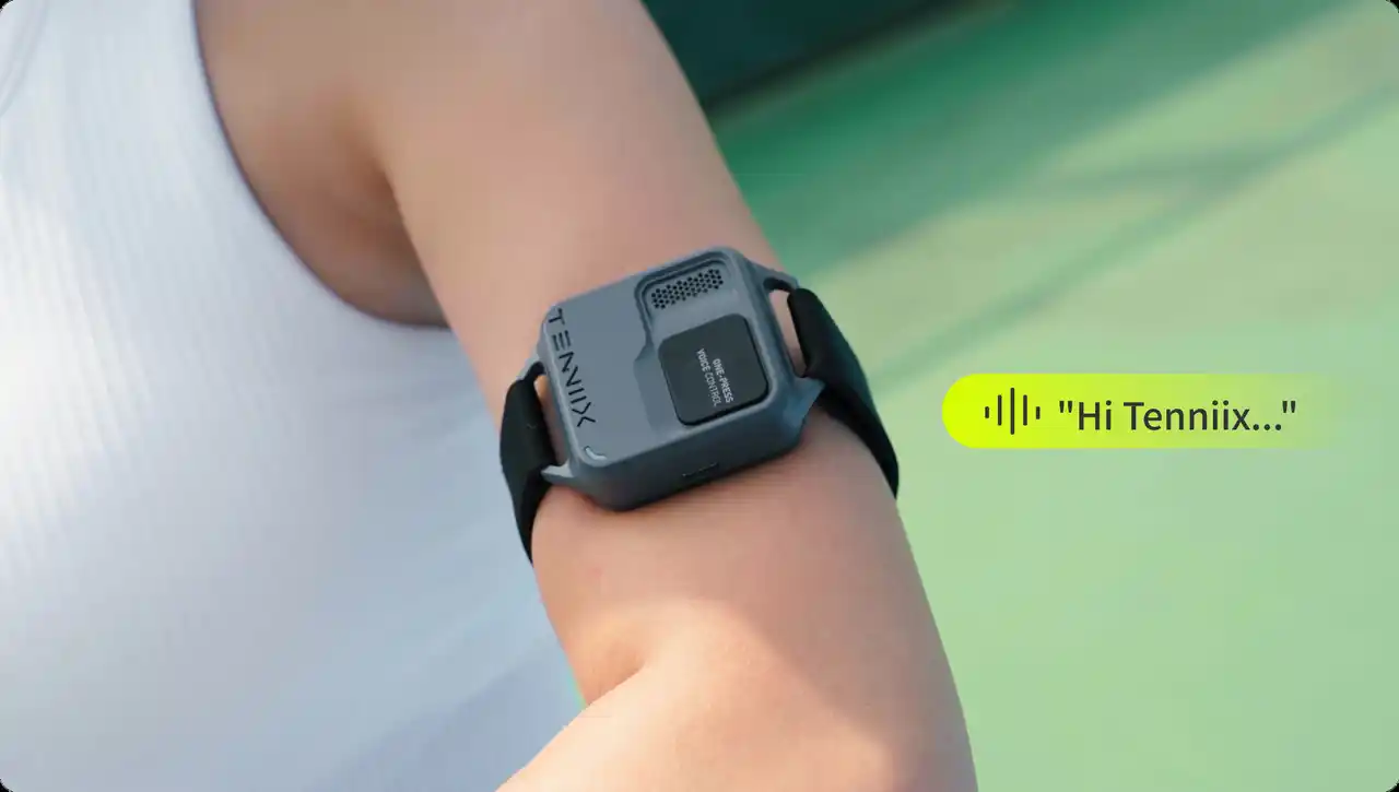 「Hi, Tenniix」と話しかけるだけ。ボイスアームバンドで、練習を止めることなく球速や回転を自由に変更できます。 |