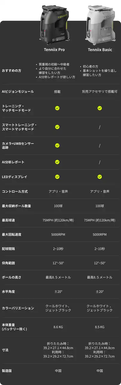 Tenniixは、AIを活用した次世代テニスロボットで、従来の球出し機とは異なり、プレーヤーの動きとボールの飛来をリアルタイムで視覚解析。コート内で自律的に位置を調整し、よりリアルなラリー形式の練習を可能にする新時代のテニスパートナーです。 |