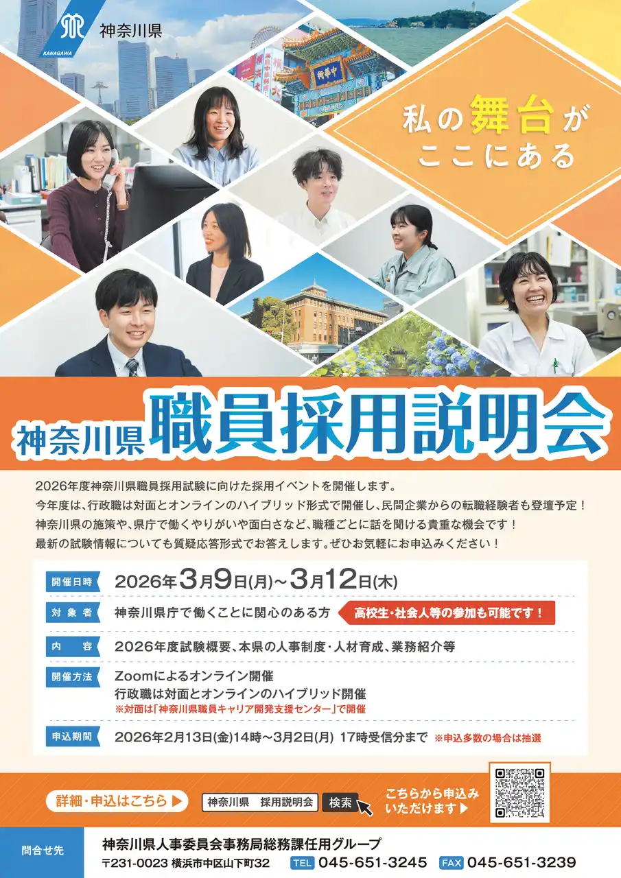 | 神奈川県では、令和8年度職員採用試験に向けて、より多くの方に県の仕事や採用試験の内容を知っていただくため、説明会を実施します。 | |||