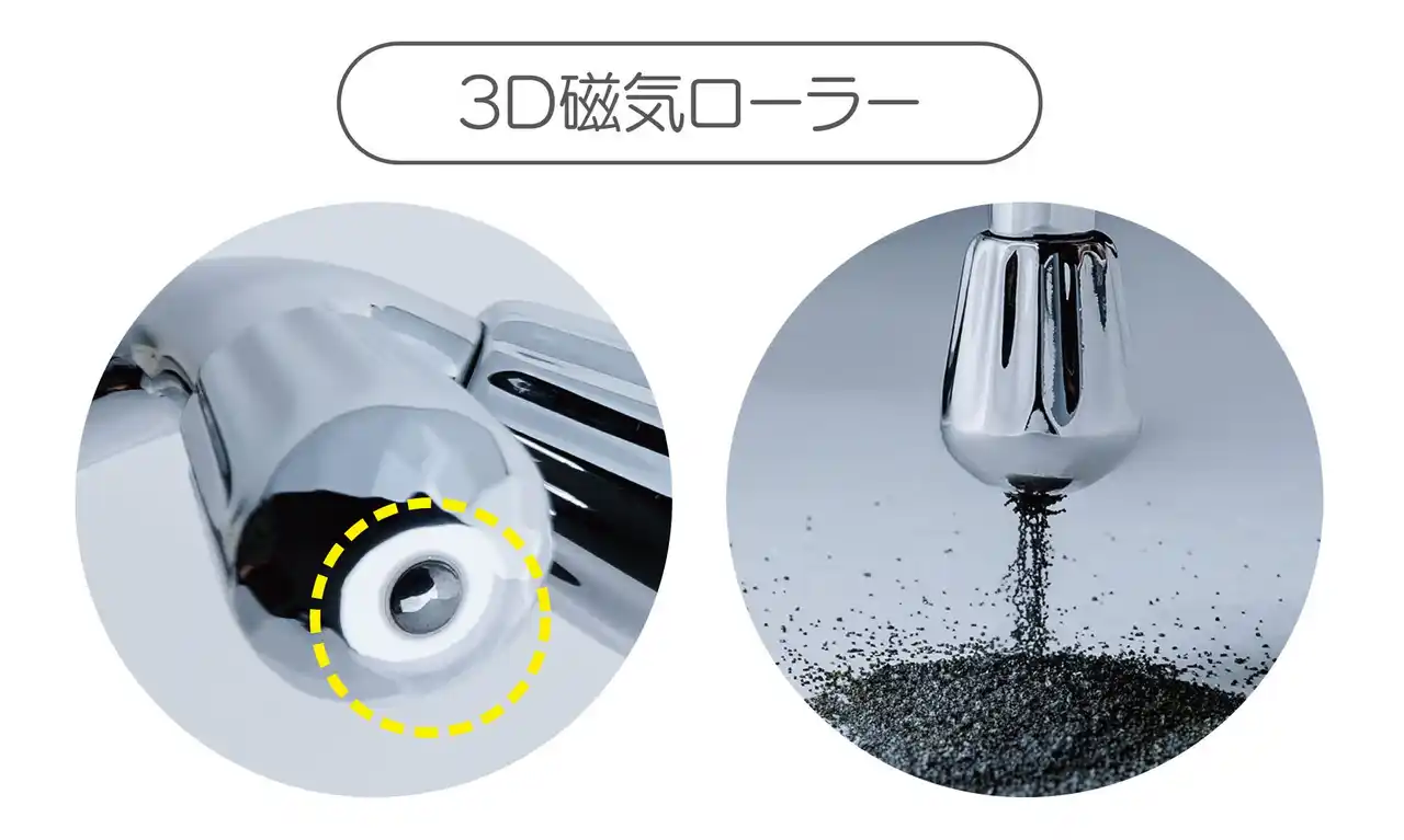 ・3D磁気ローラーが肌に吸い付くようにフィット、心地よく流す♪ |