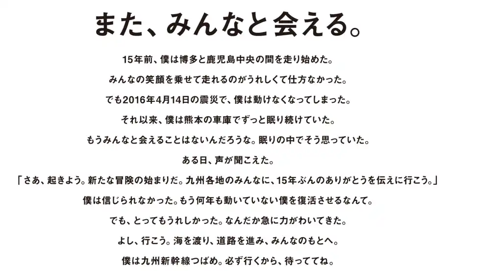 九州新幹線の歩みと、これまで支えてくださった方々への「ありがとう」の想いを伝える“感謝の旅”となり ます。10 年ぶりに動き出す「つばめ」に会いに、ぜひお越しください。 |