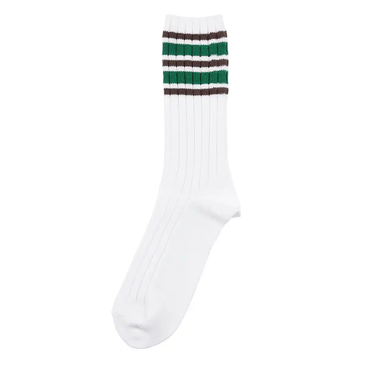 『コアラのマーチ』のパッケージを彷彿させるグリーンとブラウンのラインソックス。 |
