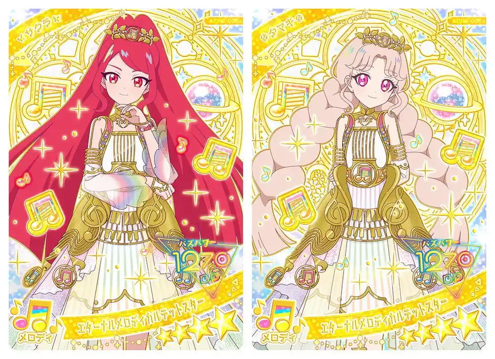 「リング6だん」では3月13日(金)に公開となる「映画ひみつのアイプリ まんかいバズリウムライブ!」に登場する桜をイメージしたコーデ「ゆうじょうさくらツインコーデ」の「ひまり」と「みつき」が登場します。また、「カルテットスター」のエターナルコーデとなる「エターナルメロディカルテットスター」を着た「サクラ」「タマキ」「アイリ」「リンリン」がラインアップし、それに合わせ過去のエターナルコーデも再収録いたします。 |