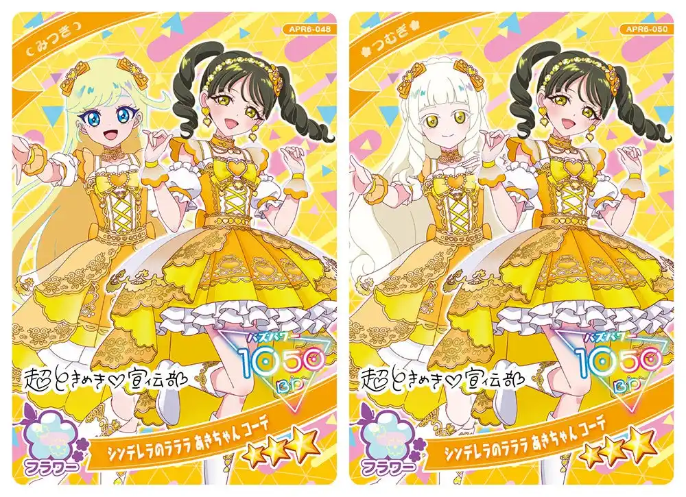 「リング6だん」で登場する「超ときめき(ハート)宣伝部」コラボアイプリカードには、テレビアニメエンディング主題歌「シンデレラのラララ(ハート)」のコーデを着た「菅田愛貴」「吉川ひより」が登場します。ラインアップは「みつき(シンデレラのラララ あきちゃん コーデ)」、「つむぎ(シンデレラのラララ あきちゃん コーデ)」 、「ひまり(シンデレラのラララ ひよりん コーデ)」 、「リング(シンデレラのラララ ひよりん コーデ)」の4種類となっています。 |